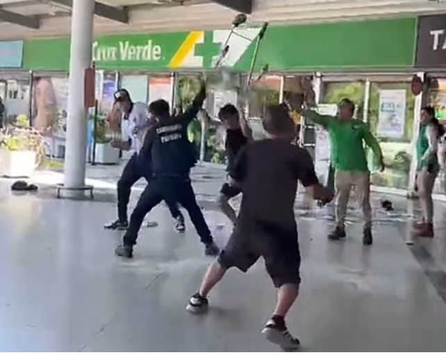 En el registro audiovisual se observa a un grupo de jóvenes enfrentándose directamente con el guardia de seguridad del recinto, en un altercado que se desarrolló a plena luz del día y frente a numerosos testigos.